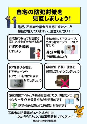 ・在宅時であっても玄関や窓に必ずカギをかけるなど戸締まりを徹底しましょう。